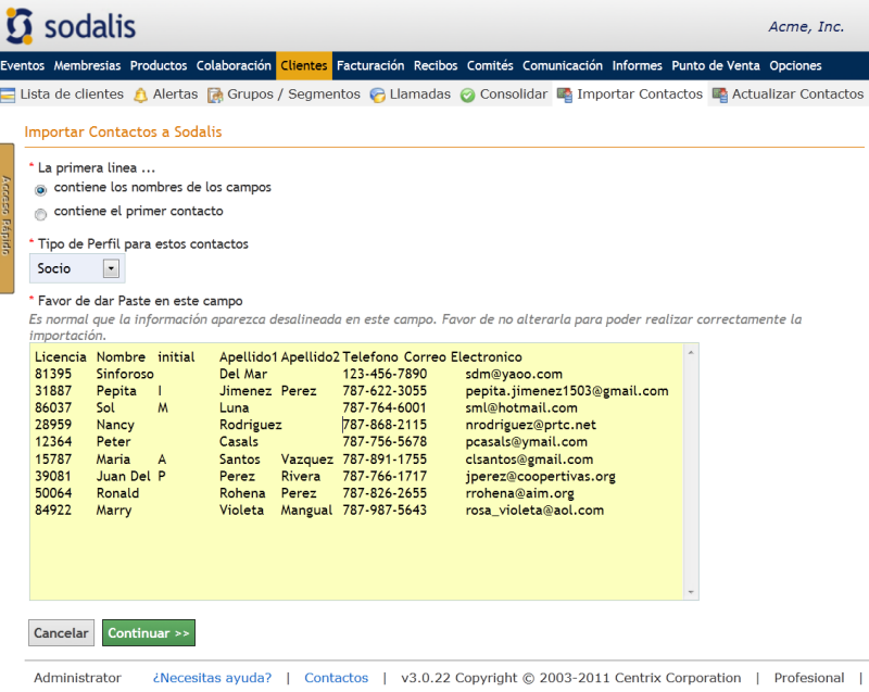 El módulo de Clientes permite el manejo de la información demográfica de sus miembros, asociados, colegiados, contactos, compañías u organizaciones a los cuales les brinda un servicio. La información de sus clientes se refleja en un perfil, en el cual se recopila la información demográfica necesaria para la organización. Adicional en este módulo podemos: