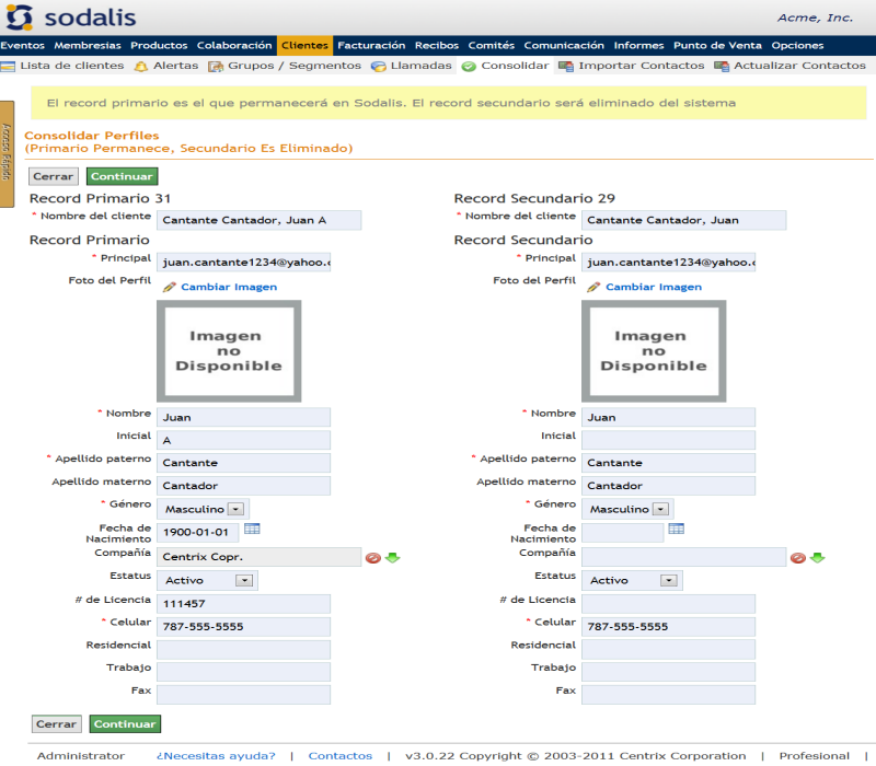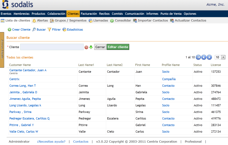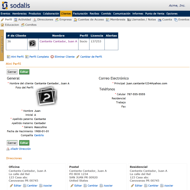 El módulo de Clientes permite el manejo de la información demográfica de sus miembros, asociados, colegiados, contactos, compañías u organizaciones a los cuales les brinda un servicio. La información de sus clientes se refleja en un perfil, en el cual se recopila la información demográfica necesaria para la organización. Adicional en este módulo podemos: